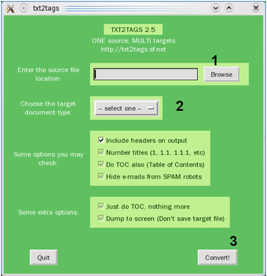 不同用户的需求和使用环境不同,txt2tags相应的也具有灵活的执行方式。