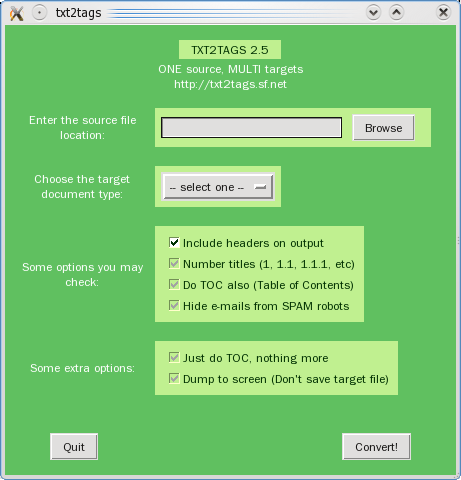 自1.0版本开始,txt2tags就有一个能工作于Linux、Windows、Mac以及其他操作系统之上的图形用户接口。