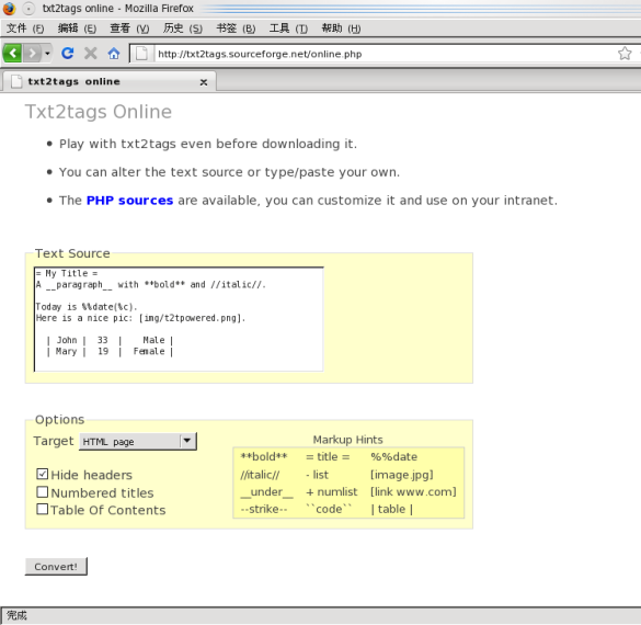 基于Web的界面可以通过互联网地址http://txt2tags.org/online.php来访问,你可以在下载之前先试用txt2tags。